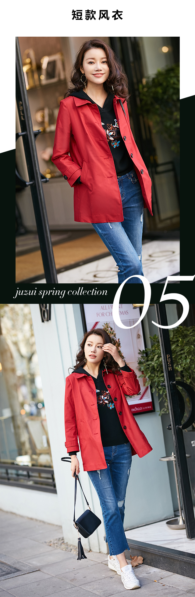 相比长款风衣,短款风衣更加地干净利落,它的长度在膝盖以上10-15厘米左右,翻领与撞色纽扣设计满溢活力,红色更显热情,是驾车族、户外党们的不二之选。