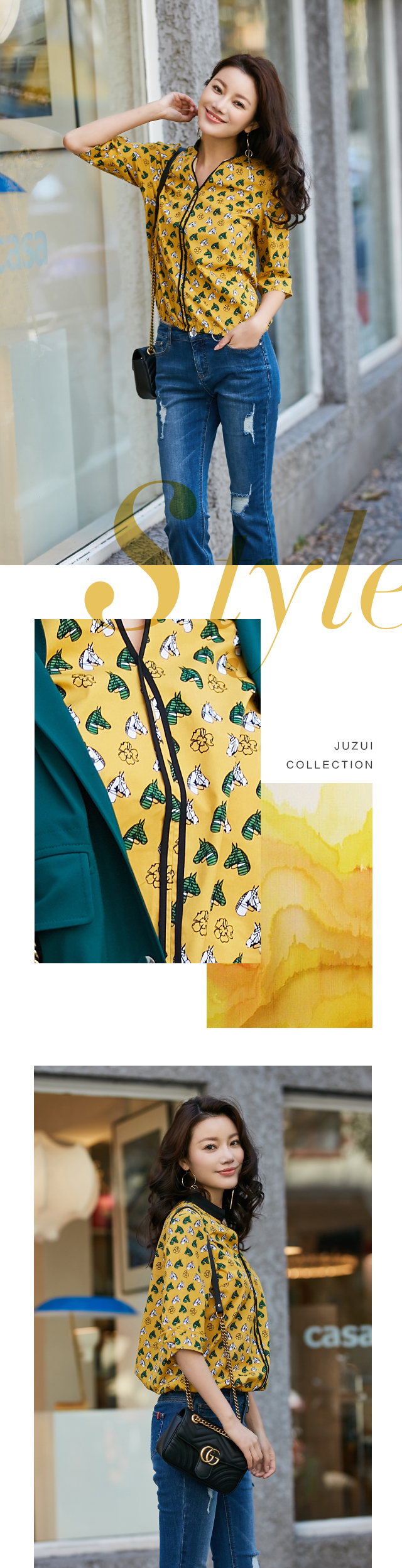 花与蝶的姻缘自古就有,花与马的组合,可曾见过?本季,设计师童心“泛滥”,孕育出了四叶马头花,云雀黄小衫上,四叶草与小马儿交错排列,趣意盎然,下搭撕边牛仔裤,活力四射,自然青春减龄。
