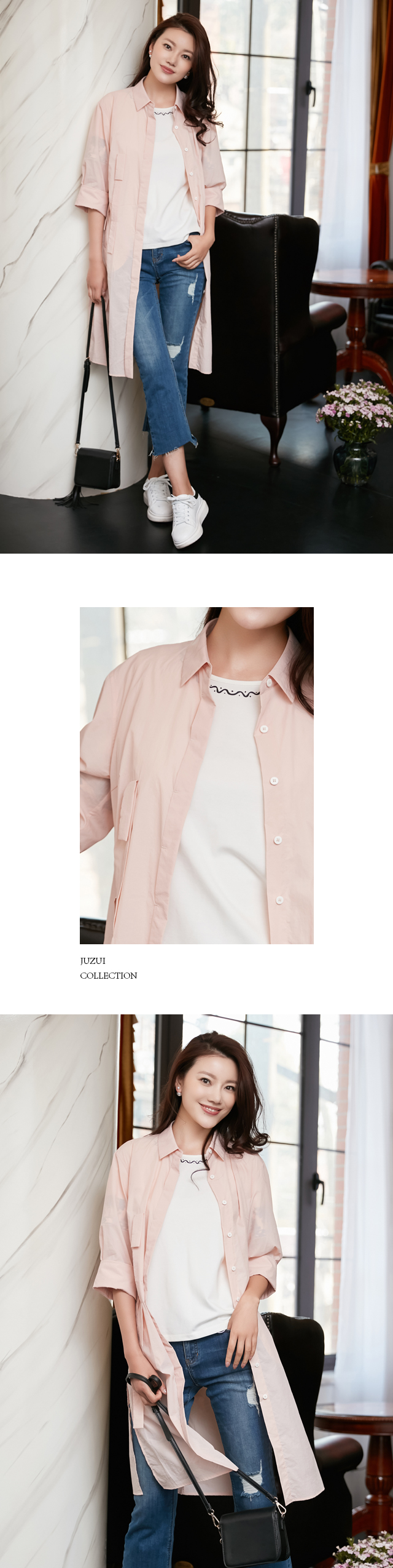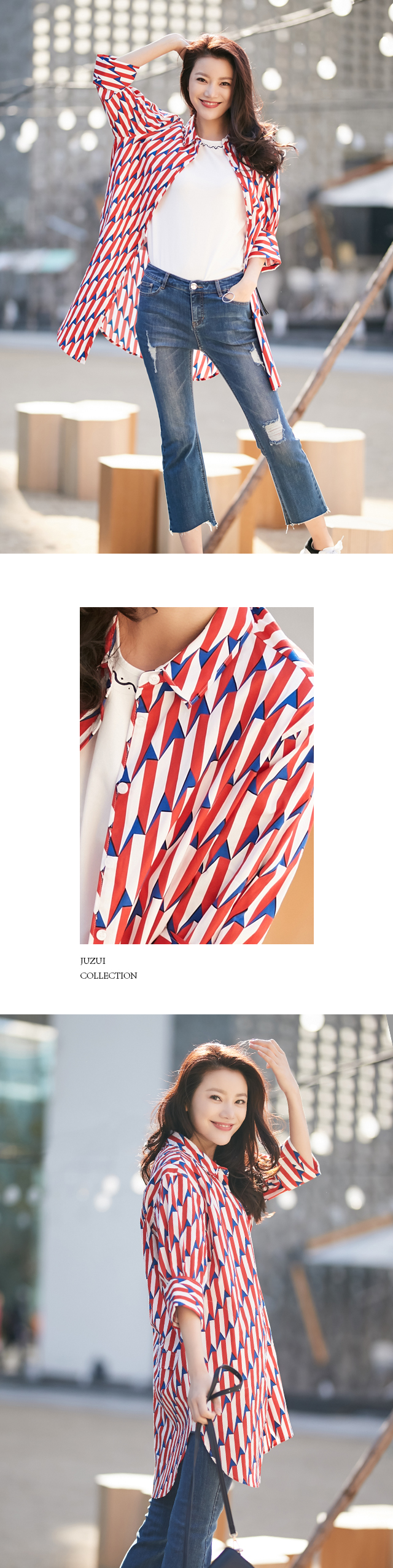 同样花型的衬衫搭配磨边牛仔裤,特别适合这样穿暖花开的时节穿着,茧型设计,极具包容性,带来不受束缚的轻松状态,从身至心,一起放飞在樱花的海洋吧。