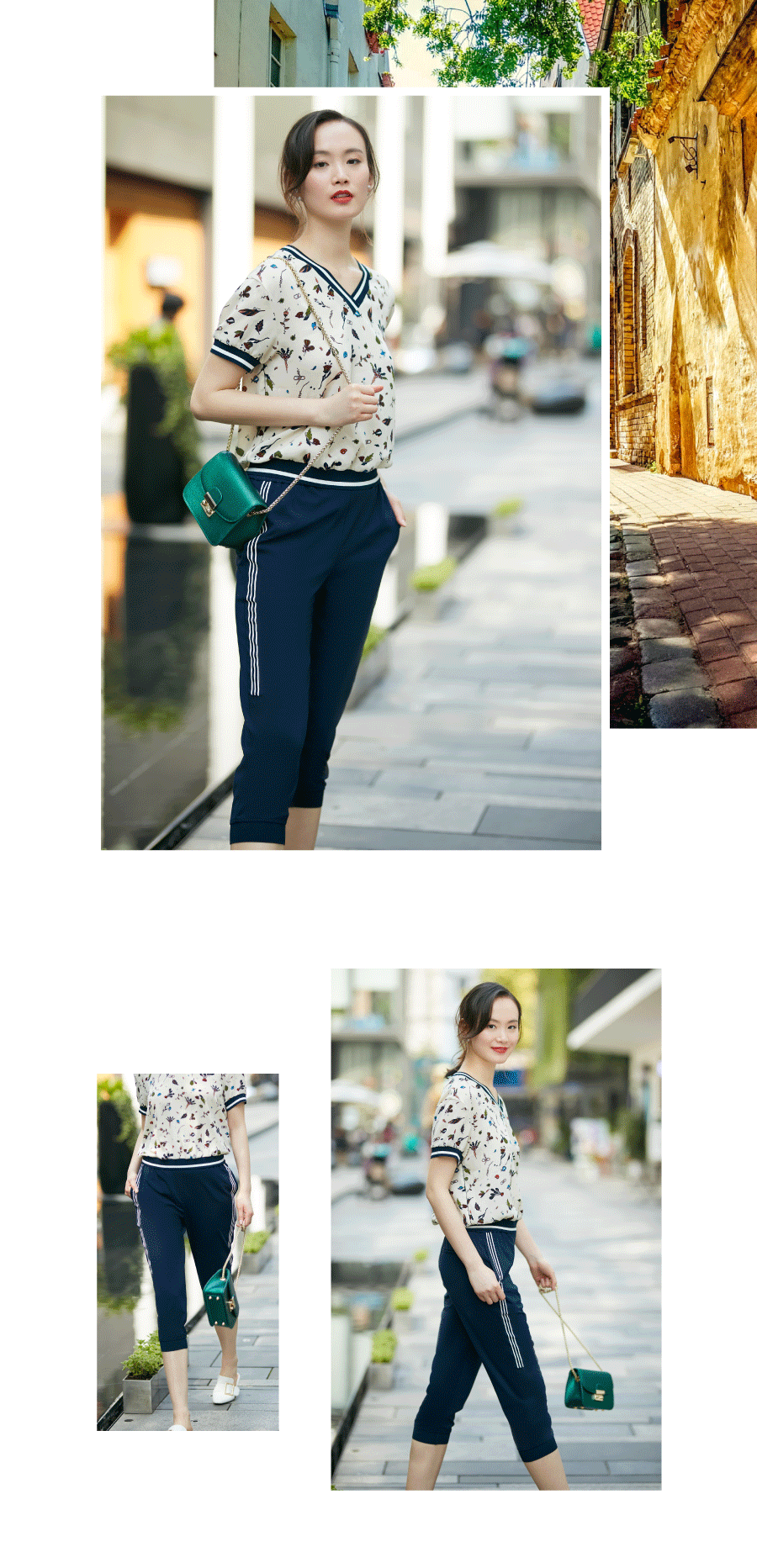 裤装的运动感的确会比裙装来得直接,可相对的,穿出时髦感的难度就增加了,所以,成套穿着,依旧是省力的好方法,相互呼应的条纹可以为整理造型加分,同时,V领设计的海洋碎花上衣显瘦清新,不正是这夏日运动风的极佳表现嘛!