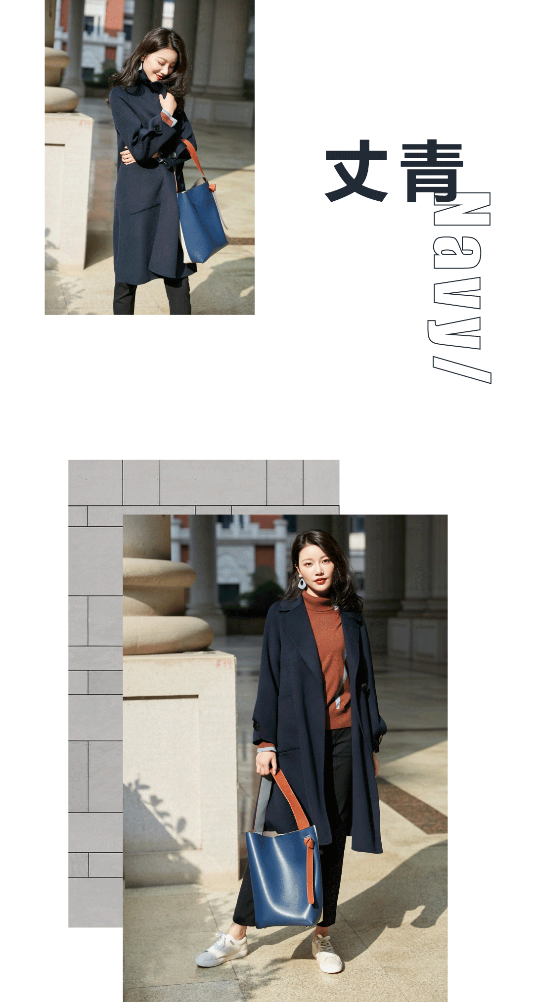 柔软质感加上挺括外型,赋予了区别于其他大衣的气场。与同款驼色带来的优雅不一样,丈青显得更为沉稳。