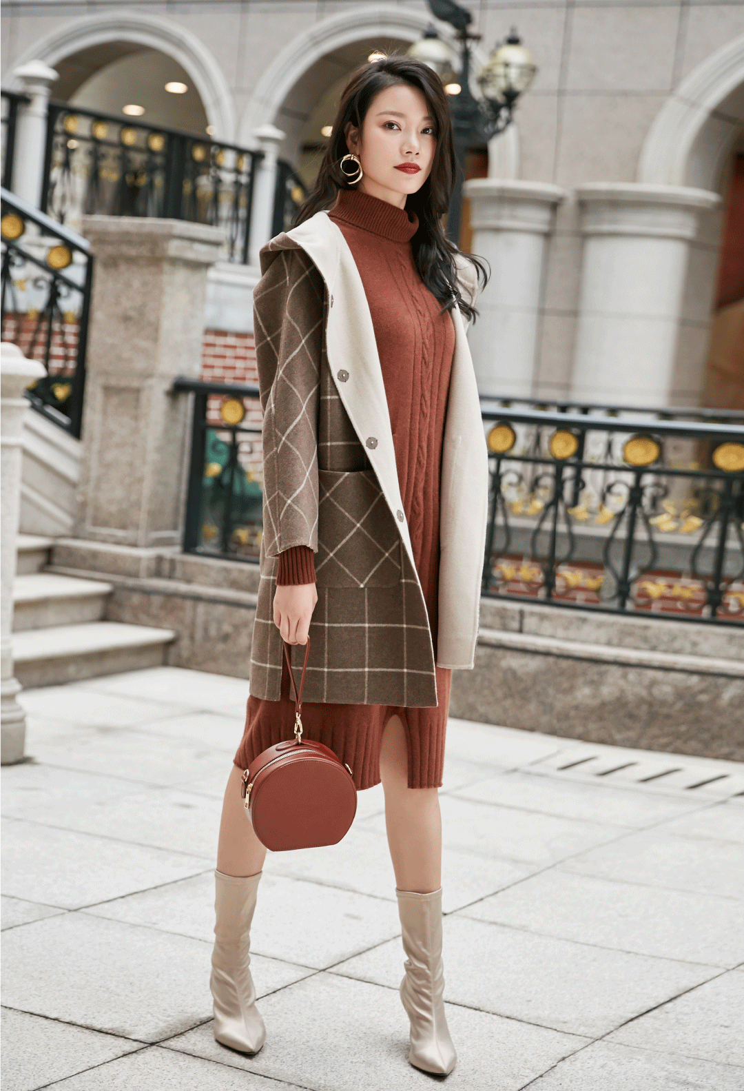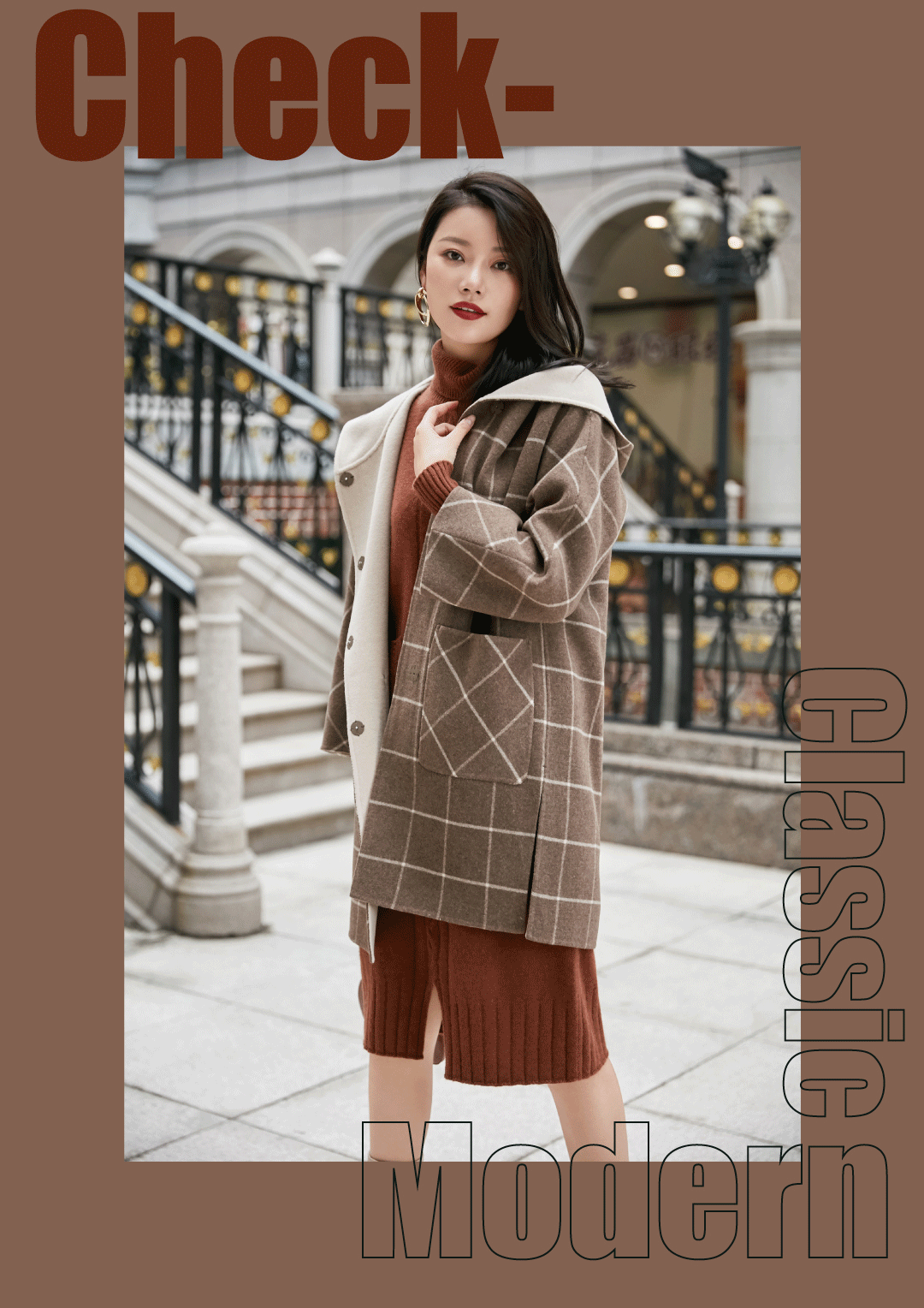在如何表现英伦风范的问题上,格纹是不会出错的。米咖相间的窗型格子,既带些复古意味,又不乏摩登新意。连帽及开衩设计,注入年轻活力。