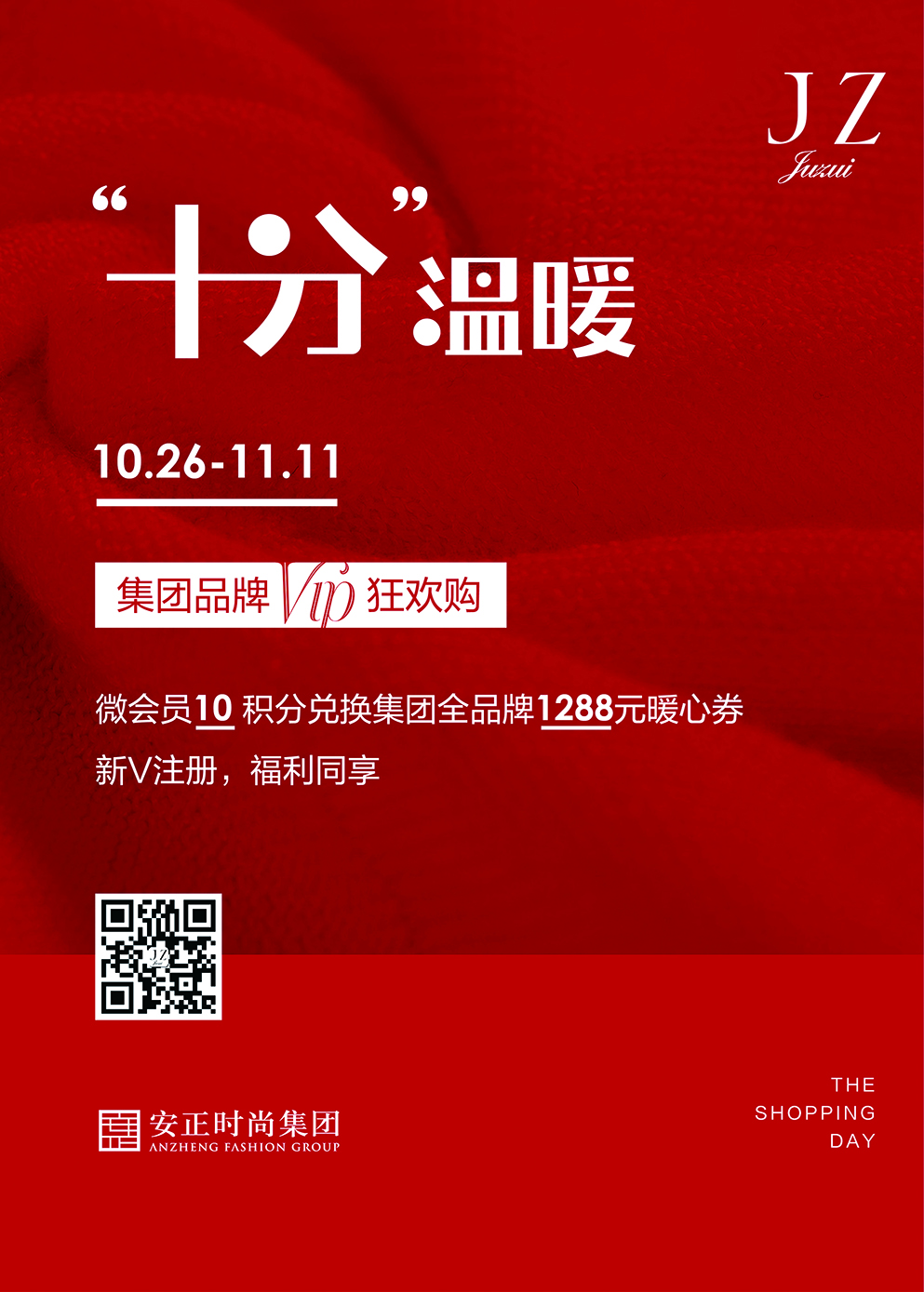 10.25-11.11,安正时尚集团旗下,JZ玖姿、IMM尹默、ANZHENG安正、Fiona Chen斐娜晨、MOISSAC摩萨克,品牌狂欢购,微会员仅10积分可兑换1288元集团暖心券,各类冬季新款,可别错过呦。